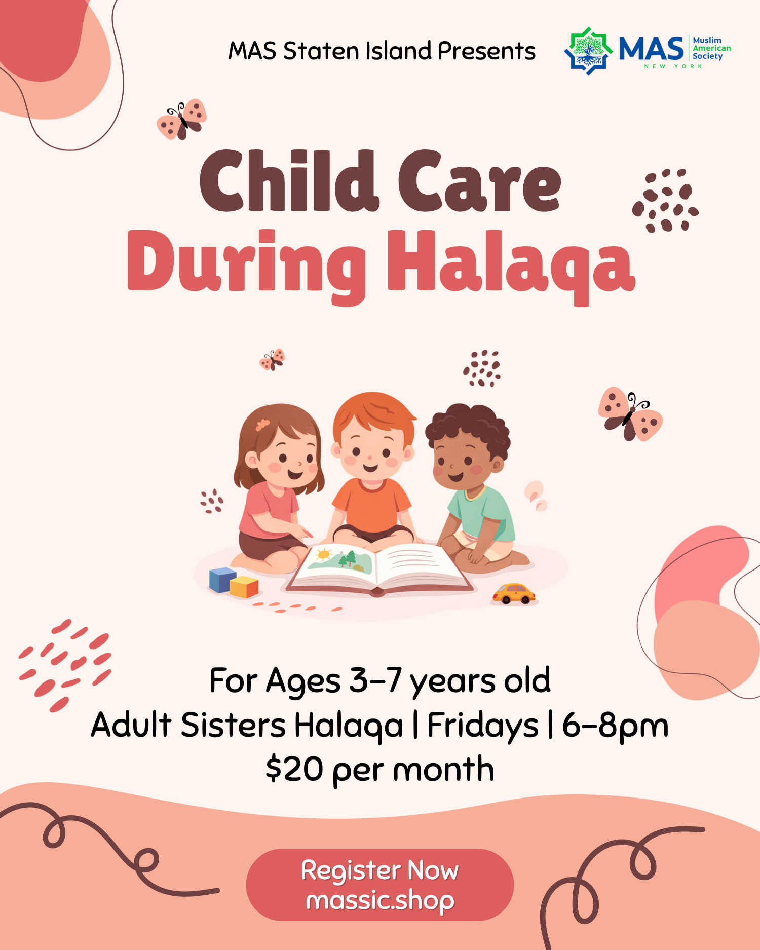 This program allows moms to attend the halaqa with peace of mind while their children are cared for in a safe, structured, and engaging environment. Activities are age-appropriate and designed to keep children happy, active, and supervised throughout the session.