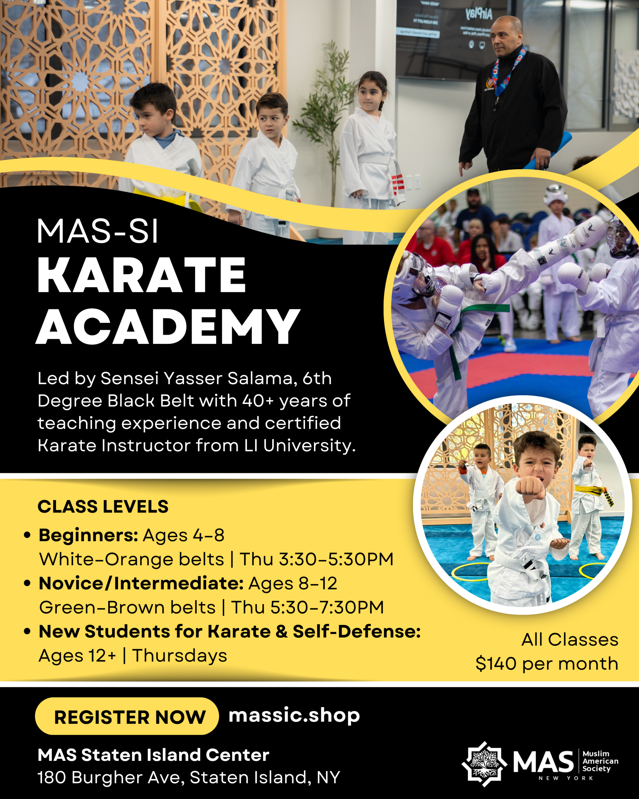 Join the MAS-SI Karate Academy led by Sensei Yasser Salama, a 6th Degree Black Belt with over 40 years of teaching experience and certified Karate Instructor from Long Island University. Our program combines the art of karate with character-building, self-defense, and discipline in a fun, supportive environment.
